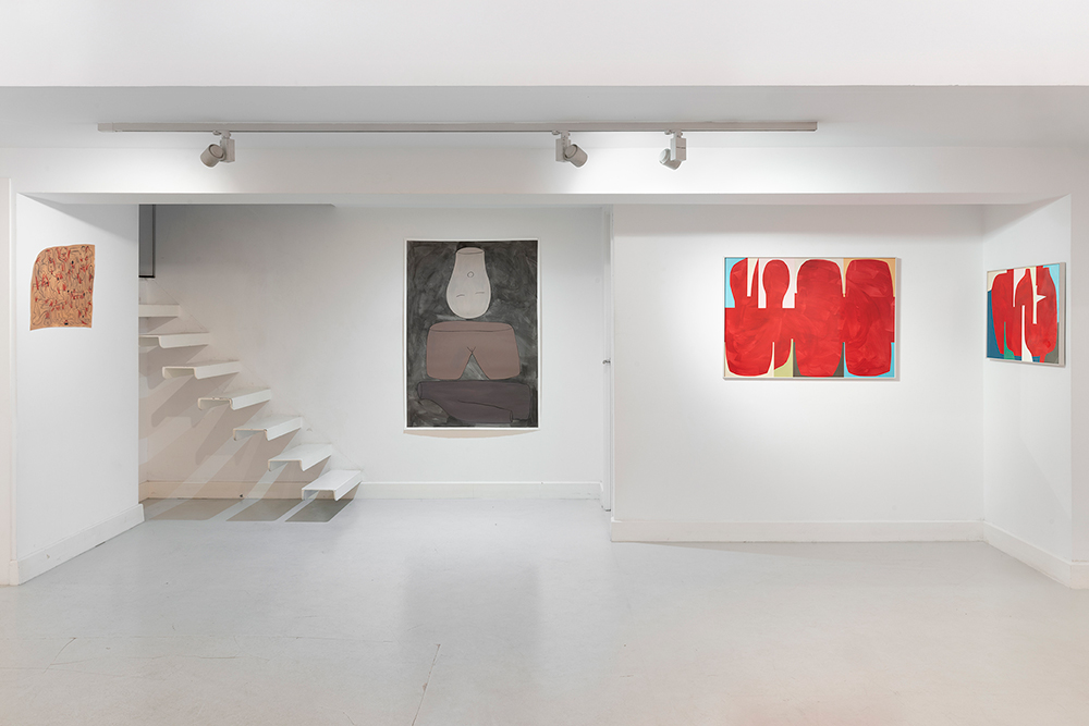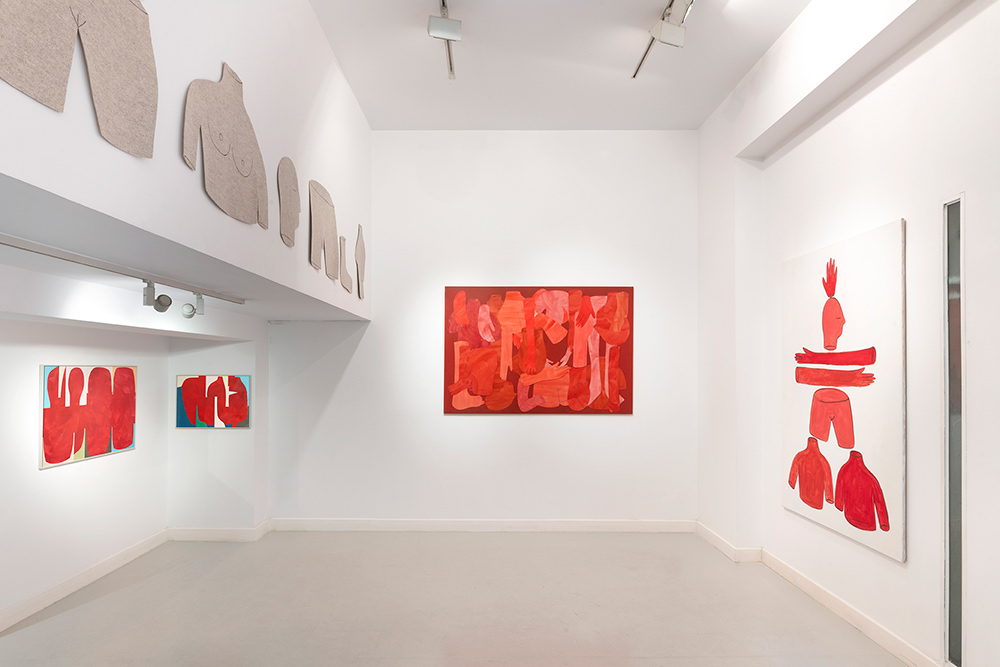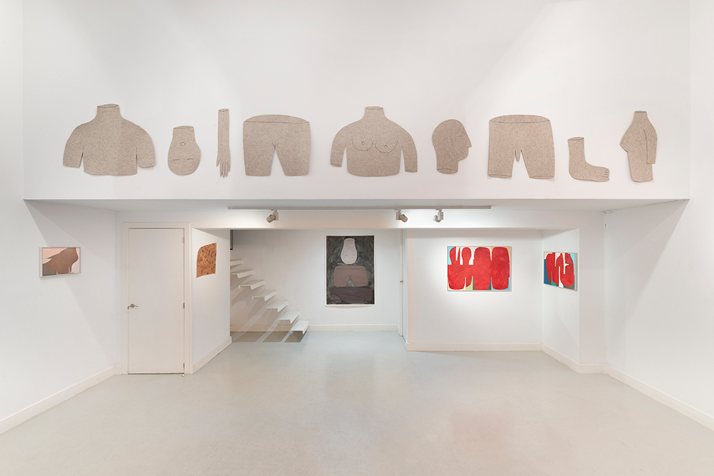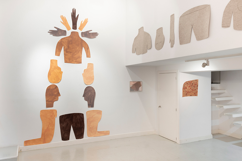 Rosalía Banet comparte con nosotros su deseo y voluntad de recuperar un ecosistema orgánico y circular, donde lo que en primera instancia aparece fragmentado, nos conduce hacia un nuevo orden en el que las categorías y estructuras se diluyen. En Colección de fragmentos animales, producida específicamente para la exposición, la artista presenta un friso de veinticinco siluetas de fragmentos del cuerpo humano realizadas con fieltro 100% lana. El mármol y los cuerpos hercúleos de los frisos de época grecorromana, son substituidos por un material orgánico. A su vez los cuerpos han dejado de representar a rotundos dioses y héroes, para representar a un ser humano frágil, desconectado de su cuerpo, pero con un anhelo de reconstrucción y reencuentro con el entorno natural. Esto sucede también en la pieza Totem 3, un conjunto de papeles pintados sobre pared, en el que Rosalía Banet reinterpreta de nuevo esa herencia del espacio público, del monumento y de la representación simbólica de la divinidad, para ubicar a un cuerpo humano en fase de reinvención y conexión con sus orígenes.