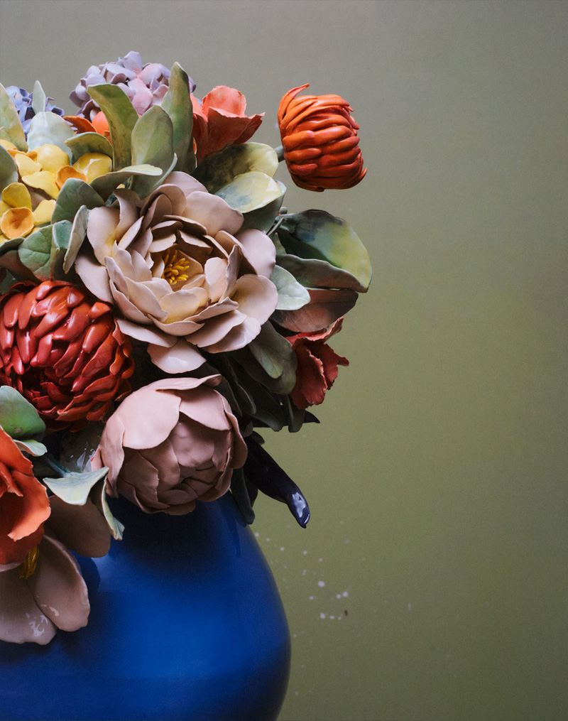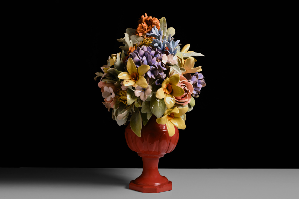 Son naturalezas muertas, flores, objetos, pequeños escenarios que se afirman en su condición de artificio, composiciones donde el detalle se acumula y la forma se intensifica hasta rozar el exceso. Si aparece una distancia, no es para generar incomodidad, sino para amplificar la percepción: lo familiar se subraya, se expande, se celebra.